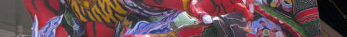 ねぶたが巨大なら太鼓も巨大です。ねぶたの囃子には太鼓・笛・シンバル・鈴などと跳ねと達のヤッテマレ・ヤッテマレ・ヤッテマレの掛け声でねぶたを盛り立てます。近年黒子なる悪ガキが跳ねとの列になだれ込み暴力を振るう事件が有った為に跳ねとの周囲はロープで警備員が囲んだままで移動します。 |